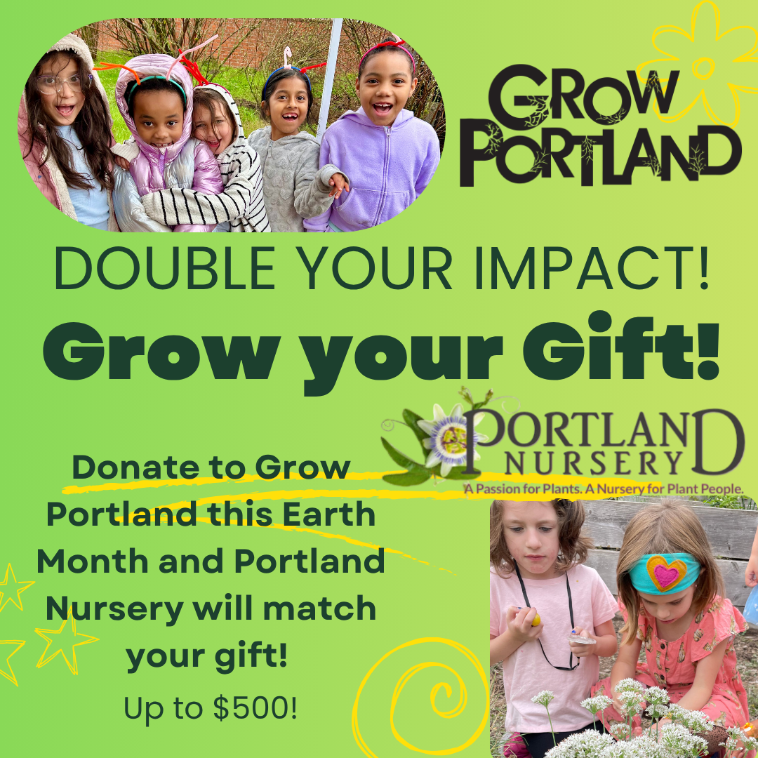 This April, in celebration of Earth Day, Portland Nursery is generously offering a $500 matching gift to support Grow Portland! That means every dollar you give will be doubled (up to $500) helping us expand hands-on garden education and deepen connections to food and nature for local students. Join us in honoring the Earth by giving this month and making your impact go twice as far. Thank you!